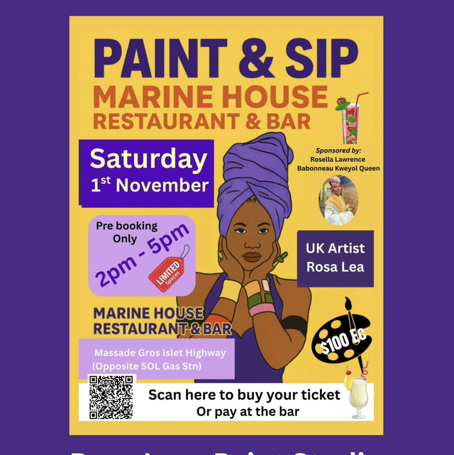 This special edition Paint & Sip will be officially opened by Rosella Lawrence – the Babonneau Kweyòl Queen 2025 👑, who passionately supports local creativity and culture